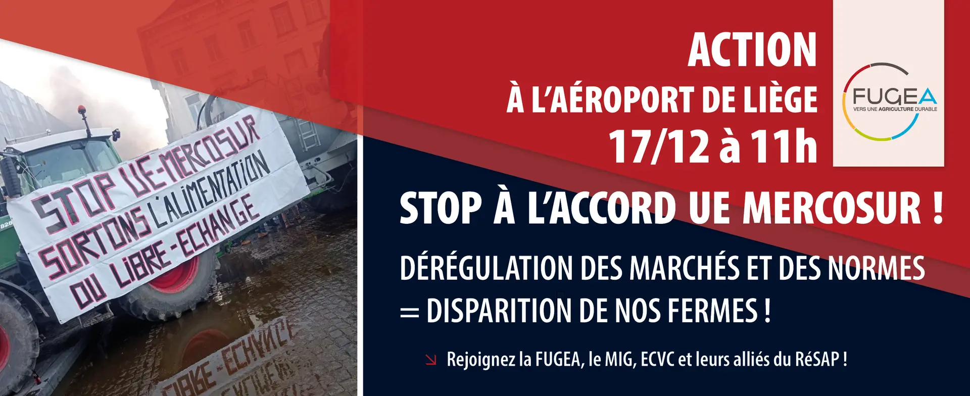 Face aux décisions incohérentes de l’Union européenne concernant l’avenir du secteur agricole, en particulier la pression pour signer l’accord UE-Mercosur, une action aura lieu ce mercredi 17 décembre à l’aéroport de Liège (infrastructure qui permet le déploiement d’un commerce agricole international injuste et dangereux). Cette action sera menée par différents syndicats agricoles wallons et européens (dont la FUGEA) avec le soutien de la société civile. Nous porterons différents messages :